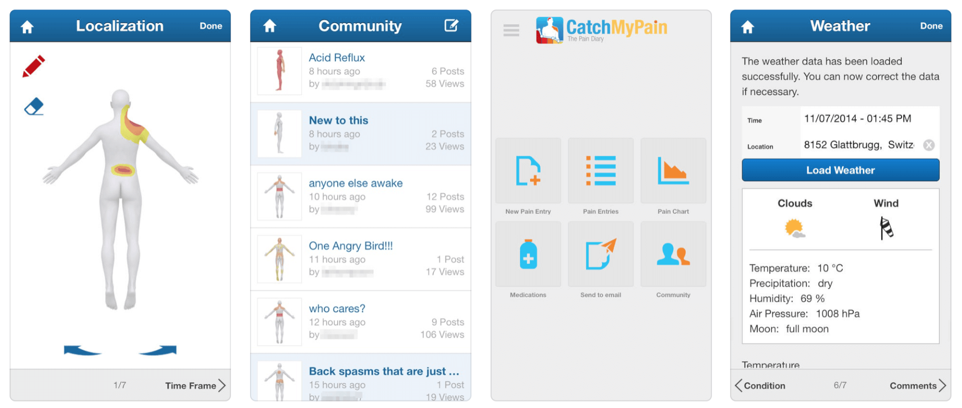 Catch my pain is een app waarbij je je pijn kunt tracken. Op een menselijk lichaam geef je aan waar op het lichaam je pijn hebt en hoe de intensiteit is, hij checkt dan van alles voor je en geeft je tips. Het is een fijne app om duidelijk inzicht te krijgen in je pijnklachten en het verloop daarvan.