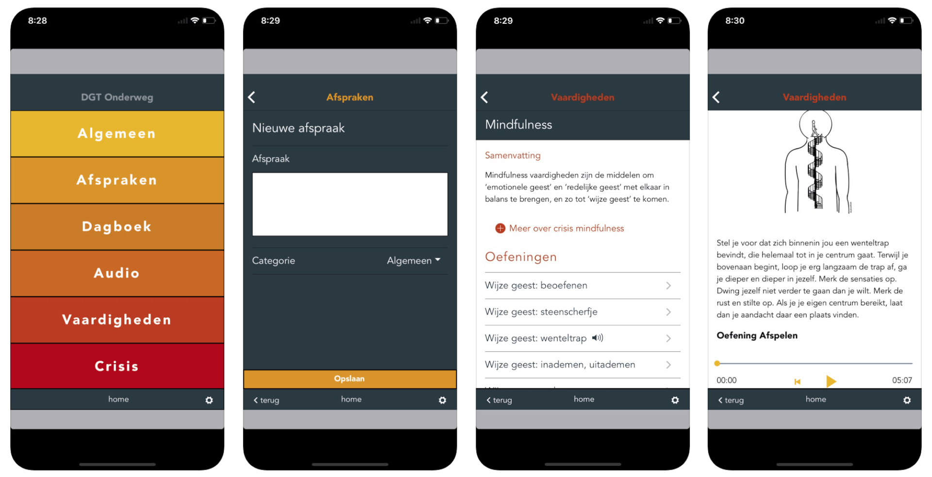 De DGT onderweg app is speciaal voor mensen met borderline, mensen die Dialectische gedragstherapie (DGT) volgen of hiermee willen beginnen. De app beschikt over 200+ vaardigheids- en mindfulness oefeningen en kan uitkomst bieden op moeilijke momenten via het ‘crisis onderdeel’ in de app. Ook voor therapeuten is deze app gunstig want het bevat een ‘denk aan’ schema met praktische aanwijzingen en afspraken die tussen therapeut en cliënt in de app genoteerd kunnen worden.
